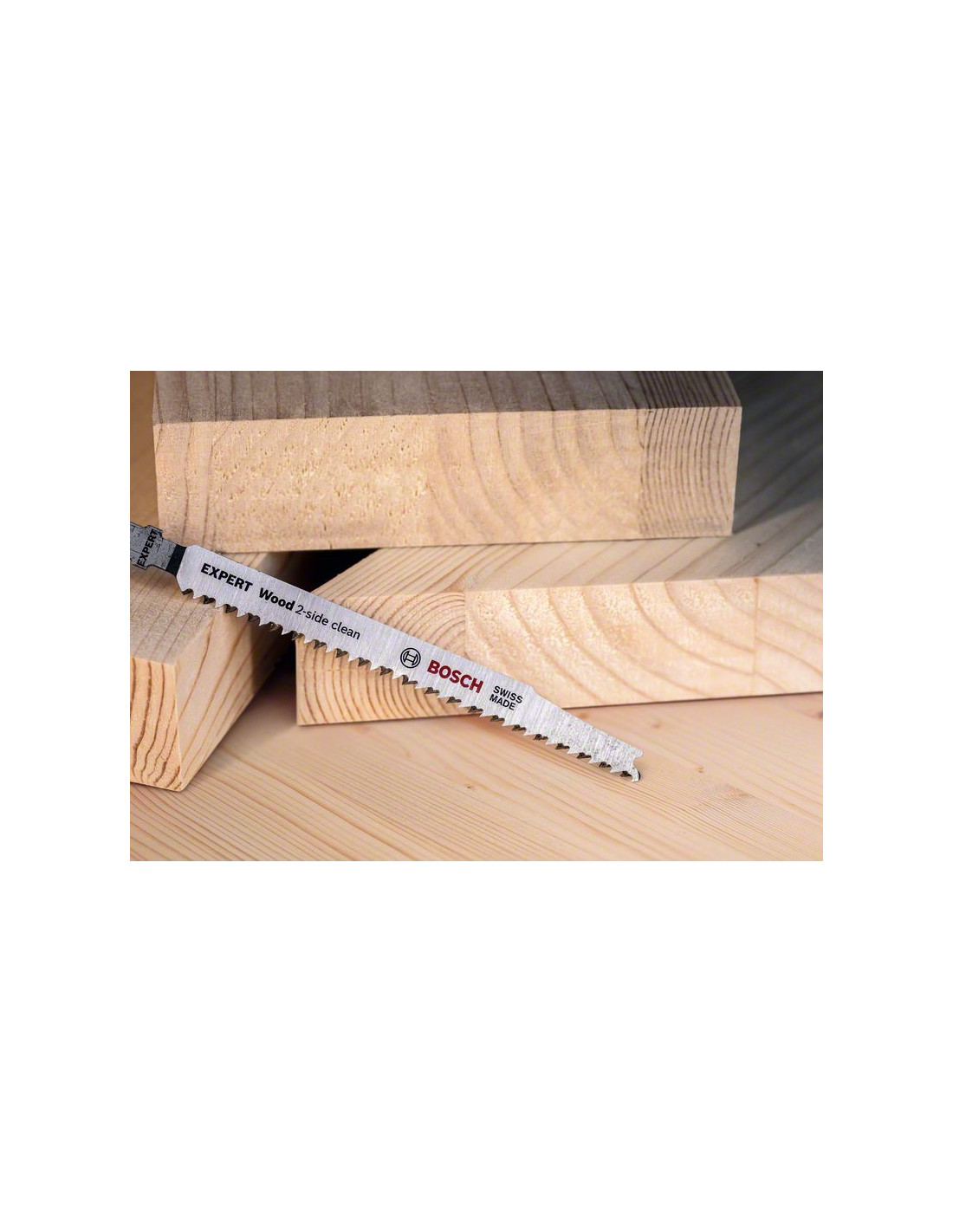 Asegurarse que el "lado limpio" de un corte realizado con una sierra de calar está en la parte visible del material de trabajo siempre ha sido un arte para carpinteros y montadores. A veces puedes dar la vuelta a la pieza de trabajo, otras veces la sierra de calar se puede sostener desde abajo. O puedes utilizar EXPERT ‘Wood 2-side clean’, que ofrece un corte perfecto sin desgarros por ambos lados gracias a su doble fila de dientes. Con el ingenioso diseño de estas hojas de sierra de calar ya no es necesario realizar ningún trabajo después de cortar: los dientes evitan que haya desgarros tanto en el movimiento ascendente como en el descendente. Esto es perfecto para los profesionales que desean ahorrar tiempo y a la vez proporcionar un trabajo de máxima calidad a sus clientes. Con sus precisos dientes rectificados para un afilado extra, la hoja de sierra de calar Bosch EXPERT ‘Wood 2-side clean’ es ideal para cortar madera blanda de hasta 50 mm de grosor. Los constructores de armarios pueden conseguir un acabado perfecto y no perder tiempo lijando después de cada corte realizado con la sierra de calar. Disponible para cortes rectos (T308B), para cortes curvos (T308BO) y para cortes precisos en ángulo (T308BP) Compatible con todas las sierras de calar con vástago de inserción en T.