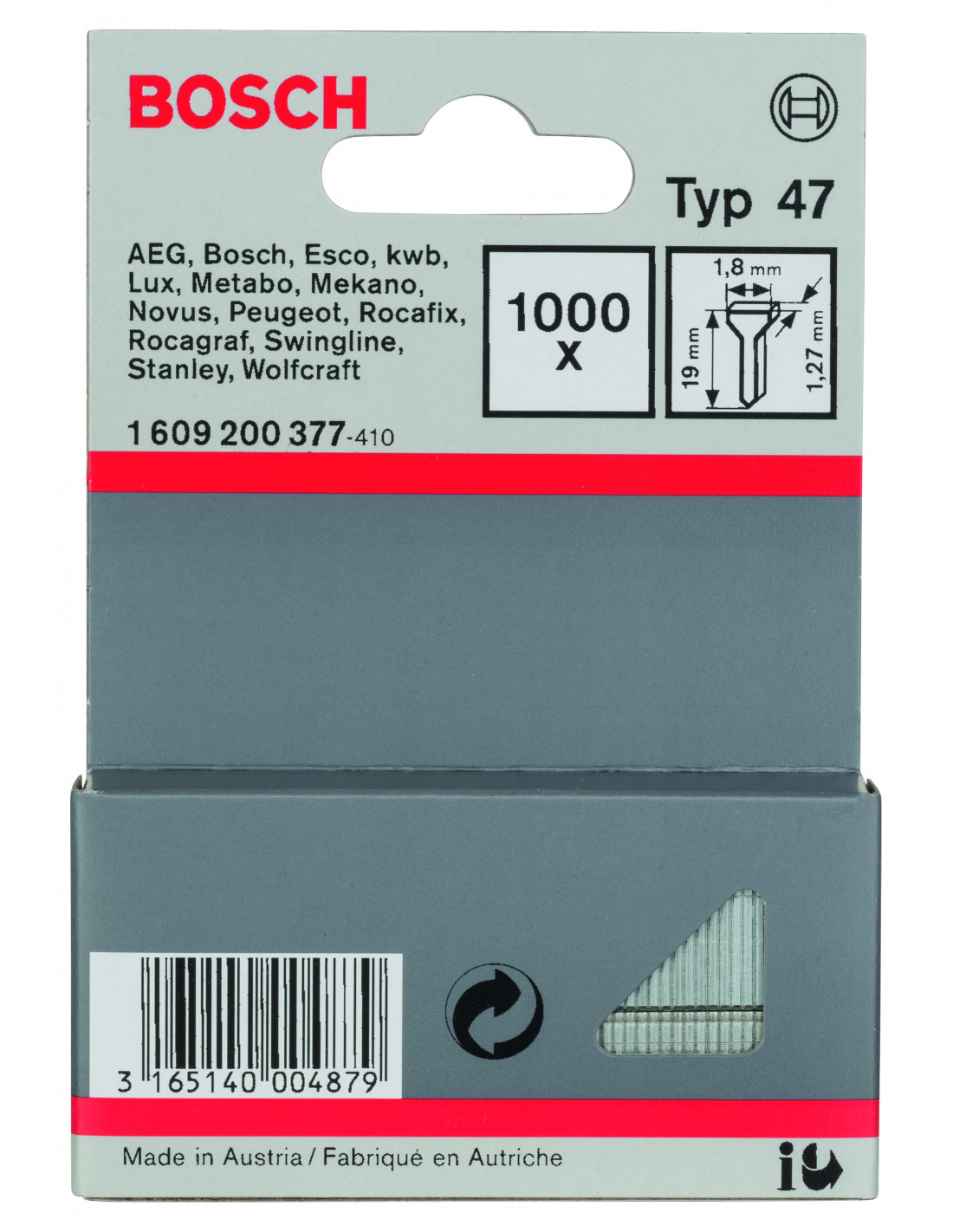 Para grapar materiales delgados y gruesos - Son adecuados para utilizar con grapadoras de AEG, Bosch, Esco, Kwb, Lux, Mekano, Metabo, Novus, Peugeot, Rocafix, Rocagraf, Stanley, Swingline y Wolfcraft. Materiales gruesos y delgados - Los clavos, de tipo 47, son para sujetar materiales delgados y gruesos. Están hechos de hilo de acero endurecido con longitudes entre 16 y 30 mm. El ancho de la cabeza depende de la máquina y puede ser de 1,8 o 2,8 mm. Son adecuados para utilizar con grapadoras de AEG, Bosch, Esco, Kwb, Lux, Mekano, Metabo, Novus, Peugeot, Rocafix, Rocagraf, Stanley, Swingline y Wolfcraft.
