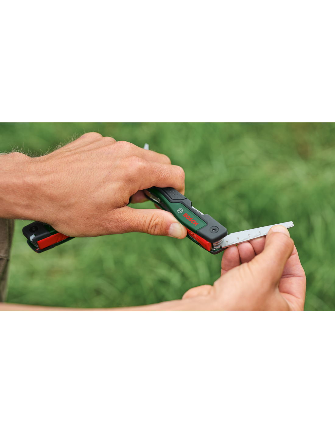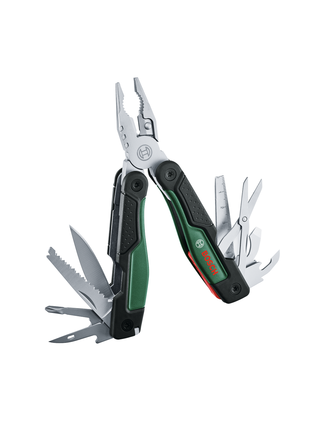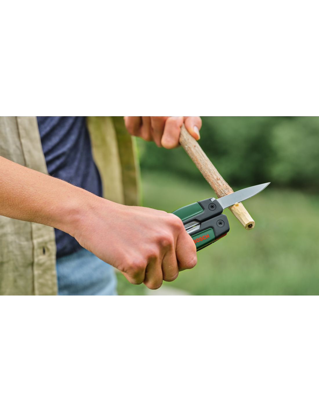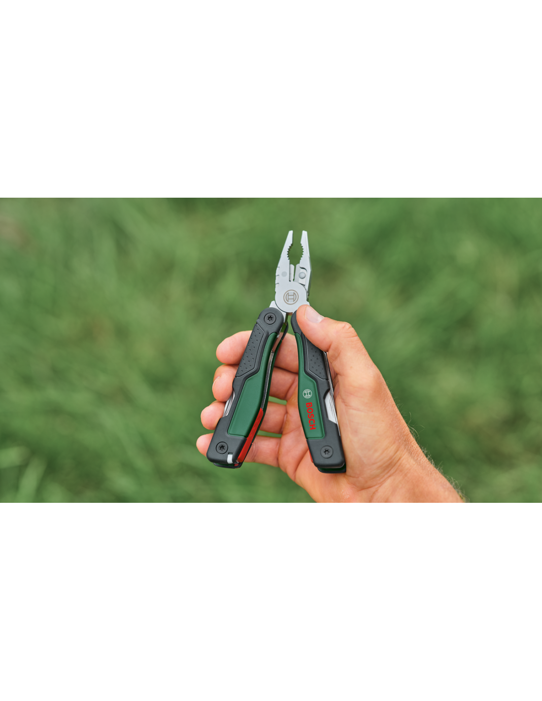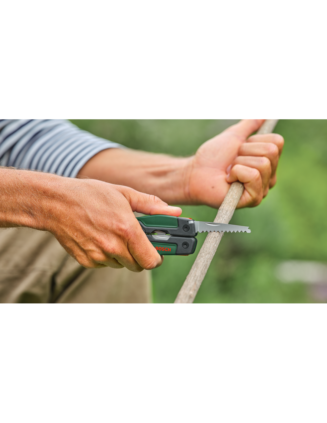 La multiherramienta robusta 16 en 1 de Bosch fácil de usar atornilla, corta madera blanda, cables mucho más. Esta herramienta multitarea de alta calidad es práctica y está diseñada para una larga vida útil, por lo que resulta útil para cualquier trabajo en casa o en la carretera. ¿Necesita quitar clavos pequeños o tornillos diminutos, o serrar pequeños trozos de madera? La multiherramienta 16 en 1 Bosch es la multiherramienta imprescindible en el taller, en la cocina y en sus vacaciones al aire libre. Cuenta con varios destornilladores y alicates, una cizalla, una sierra, una cuchilla, tijeras, lima, punzón con hilo, abrebotellas y abrelatas, un palillo de dientes, una pinza y una regla métrica: ¡perfecta para el bricolaje en el hogar, para ir de camping y para el aseo personal. Una multiherramienta efectiva y duradera: todos sus accesorios están fabricados en acero inoxidable de alta calidad y aleación de acero inoxidable con alto contenido de carbono, lo que garantiza una larga vida útil y protección contra la oxidación. La empuñadura perfilada doble con mango engomado facilita un uso cómodo y un control óptimo. Tanto los amantes del bricolaje como los campistas agradecerán el sistema de bloqueo, que permite utilizar esta excelente herramienta de forma segura. Incluye una práctica bolsa de tela para un fácil almacenamiento y transporte.