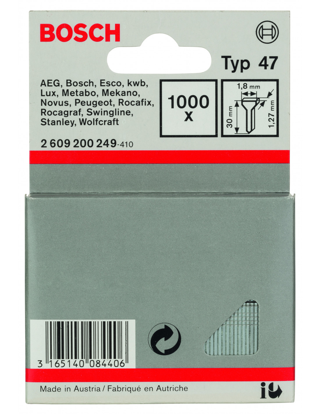 Para grapar materiales delgados y gruesos - Son adecuados para utilizar con grapadoras de AEG, Bosch, Esco, Kwb, Lux, Mekano, Metabo, Novus, Peugeot, Rocafix, Rocagraf, Stanley, Swingline y Wolfcraft. Materiales gruesos y delgados - Los clavos, de tipo 47, son para sujetar materiales delgados y gruesos. Están hechos de hilo de acero endurecido con longitudes entre 16 y 30 mm. El ancho de la cabeza depende de la máquina y puede ser de 1,8 o 2,8 mm. Son adecuados para utilizar con grapadoras de AEG, Bosch, Esco, Kwb, Lux, Mekano, Metabo, Novus, Peugeot, Rocafix, Rocagraf, Stanley, Swingline y Wolfcraft.