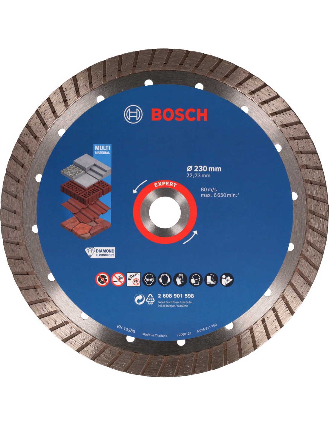 El filo de corte de este EXPERT Multi Material turbo combina las ventajas de los discos de reborde continuo y segmentado, ayudándote a trabajar más rápido y aún así obtener cortes limpios y precisos. La tecnología Bosch Diamond Technology, una matriz de metal y diamantes, garantiza que el borde de corte sea resistente y no se agriete ni se rompa. Tanto si necesitas cortar losas de piedra blanda como hormigón, mampostería o tejas, el filo de corte fuerte y con autoafilado del disco te ayudará a realizar tu tarea.