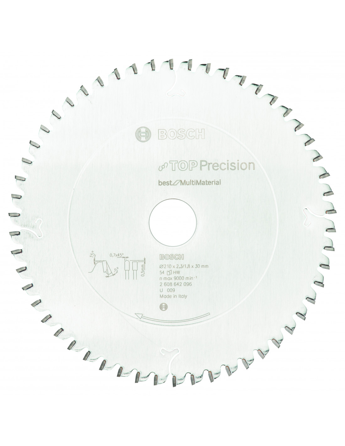 El disco de sierra circular Best for Multi Material ofrece calidad industrial en tareas muy duras en diversos materiales. - Para sierras de corte a inglete y a bisel para metal El orificio funciona con o sin anillos reductores para adaptarse a diferentes tamaños. Aplicaciones exigentes - El disco de sierra circular Best for Multi Material ofrece calidad industrial y realiza tareas muy exigentes en gran variedad de materiales. Este disco tiene dientes exclusivos Extra Hard MicroteQ fabricados internamente por Bosch a partir de grano de carburo duradero ofreciendo un elevado rendimiento. El recubrimiento Cleanteq aumenta aún más el rendimiento del disco, reduciendo la adhesión de residuos como resina y cola, de modo que garantiza unos resultados extralimpios. Además, este recubrimiento mantiene frío el disco para evitar la corrosión. Además, cuenta con ranuras antivibraciones Stabilteq de poliuretano que reducen significativamente la vibración y el ruido para un corte preciso fácil y cómodo. El disco de sierra sirve para metales no ferrosos, aluminio, plásticos, epoxy y madera. Para sierras de corte a inglete y a bisel para metal Los dientes HLTCG (dentado trapezoidal plano) hacen de Best for Multi Material un disco de sierra circular robusto para trabajar con materiales abrasivos. El orificio funciona con o sin anillos reductores para adaptarse a diferentes tamaños.