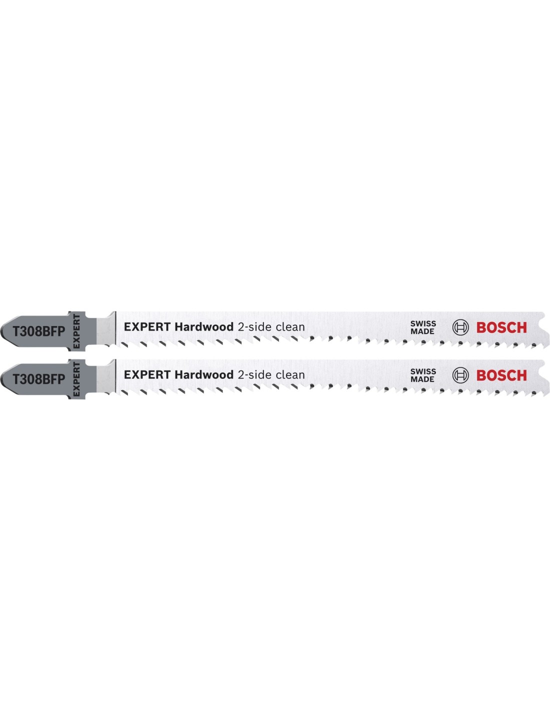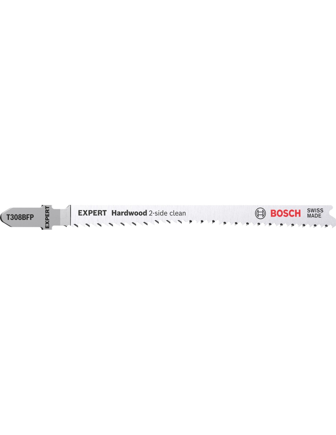 La hoja de sierra de calar Bosch EXPERT Hardwood 2-side clean, fabricada con bimetal, una tira de acero rápido adherida a una hoja de acero flexible para combinar resistencia y flexibilidad, es lo suficientemente robusta como para cortar encimeras de cocina de aglomerado laminado o madera dura. Disponible para realizar cortes rectos (T308BF) y cortes en ángulo o curvos de alta precisión (T308BFP) sin desgarros.