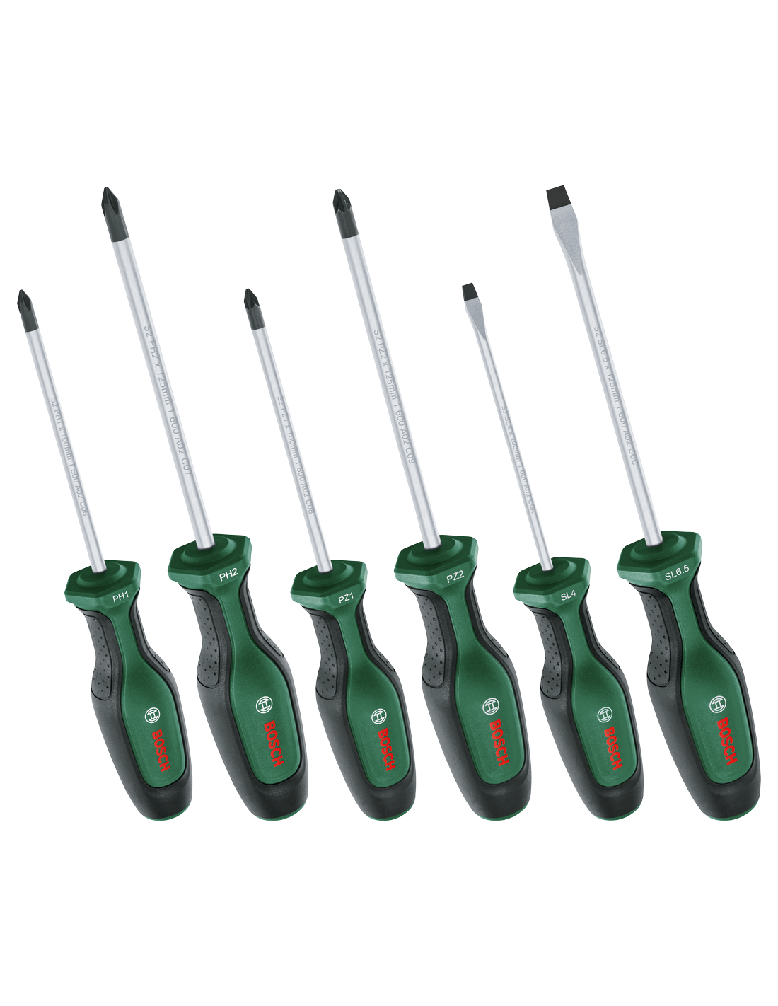 1 destornillador PH1 x 100 mm,1 destornillador PH2 x 125 mm,1 destornillador PZ1 x 100 mm,1 destornillador PZ2 x 125 mm,1 destornillador SL4 x 100 mm,1 destornillador SL6,5 x 125 mm