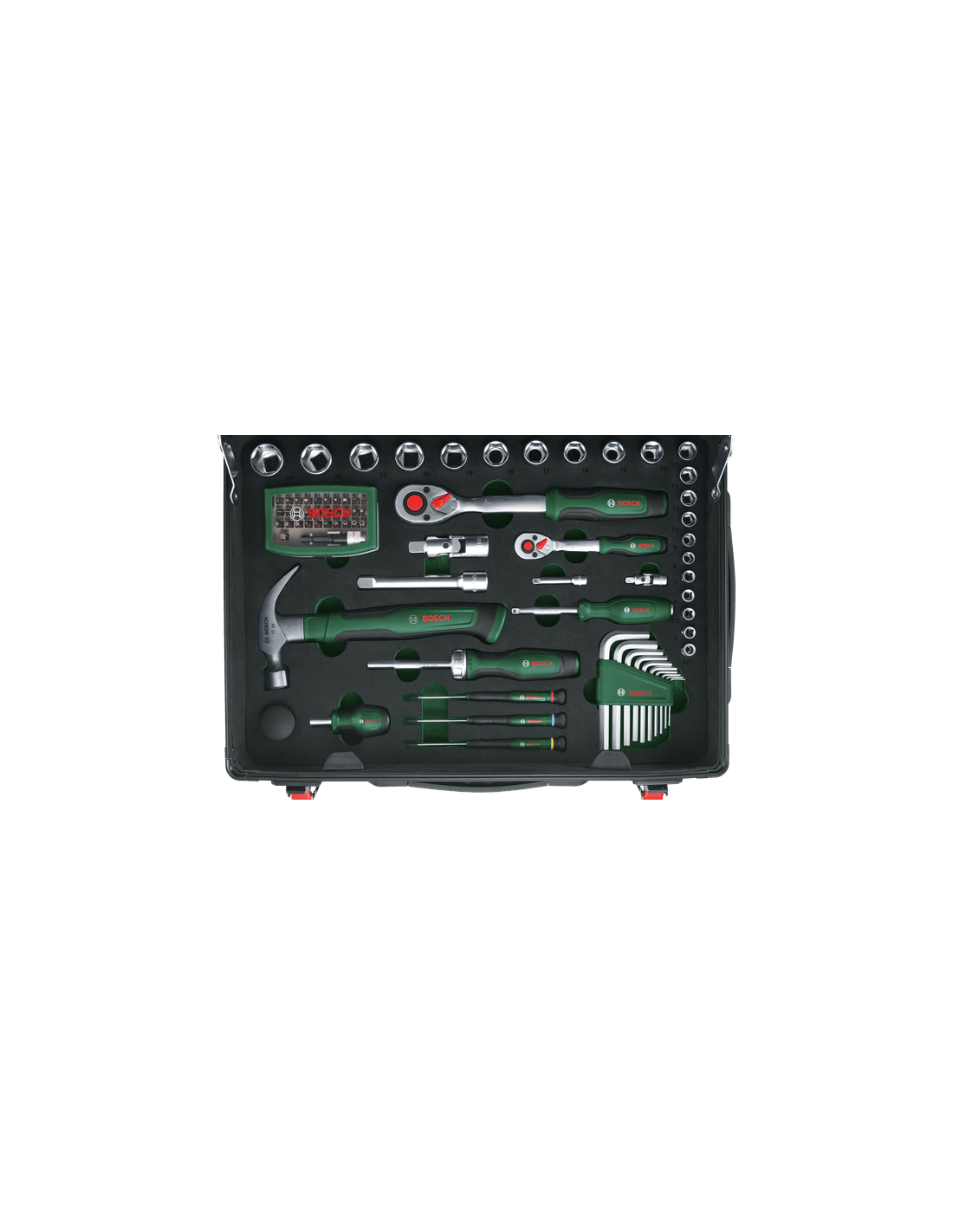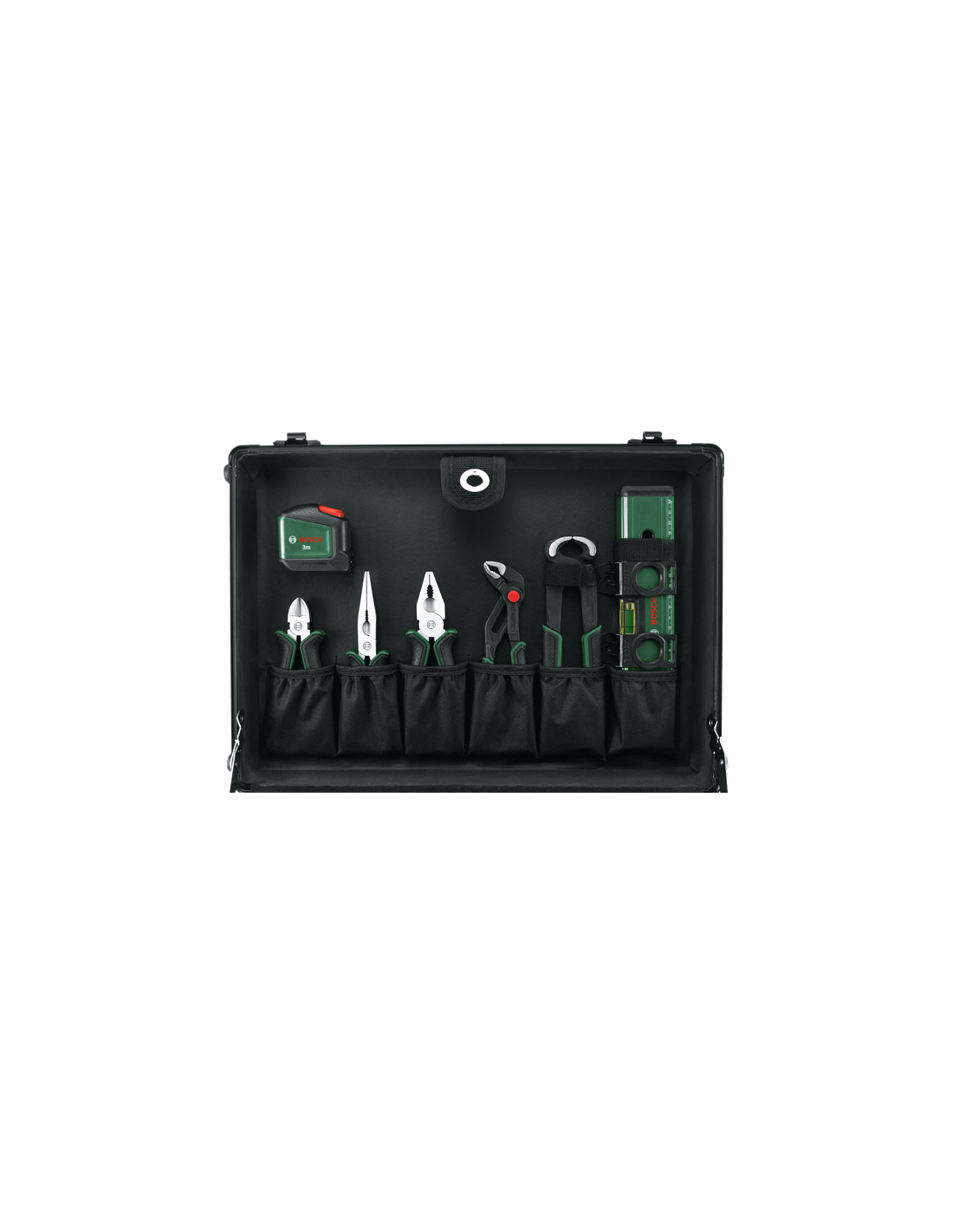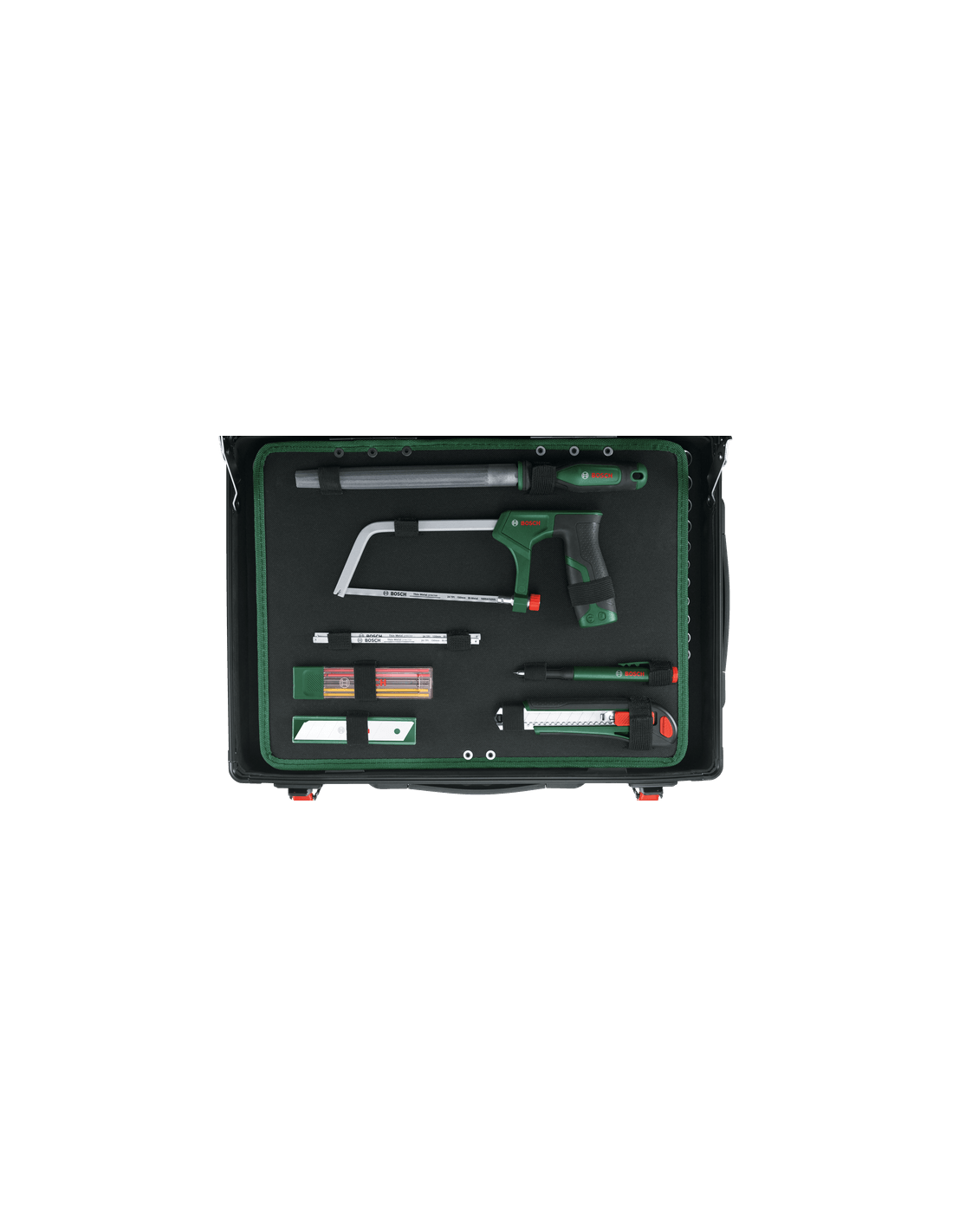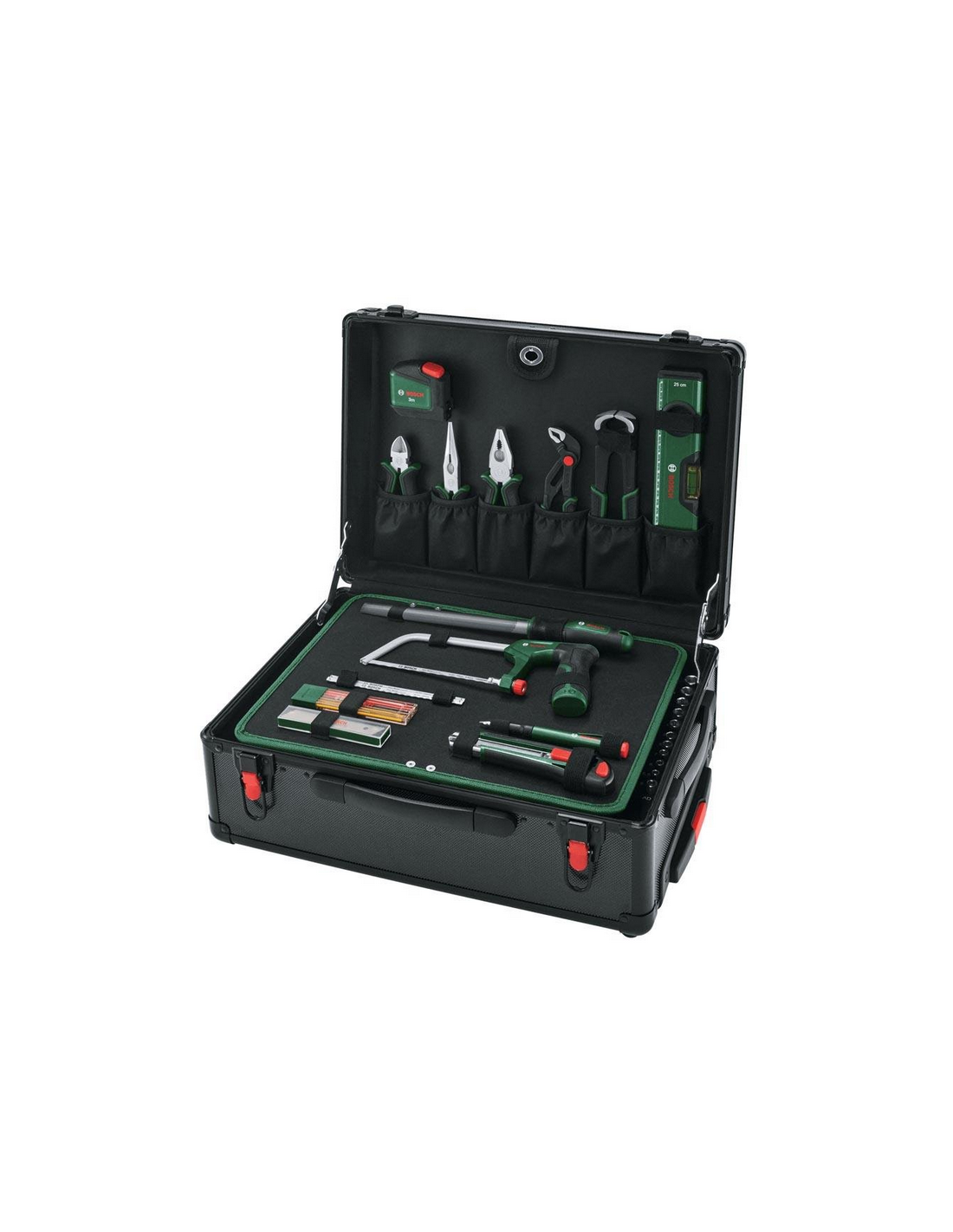 El set de maletín de herramientas con ruedas Bosch, incluye todas las herramientas manuales necesarias para las tareas de bricolaje. Cuenta con una amplia gama de herramientas manuales duraderas: alicates, carracas, destornilladores, llaves, una sierra para metales, un martillo, una cinta métrica y mucho más. Todas están hechas de materiales duraderos con diseño ergonómico y empuñadura revestida de goma. Las herramientas se almacenan en un maletín con ruedas de alta calidad que las mantiene bien organizadas y protegidas. Una empuñadura extraíble telescópica y dos cómodas empuñaduras auxiliares hacen que el maletín sea fácil de transportar en los viajes. Gracias al ingenioso sistema de almacenamiento, las herramientas están perfectamente organizadas y son de fácil acceso. La rodillera integrada permite trabajar cómodamente, incluso en el suelo.
