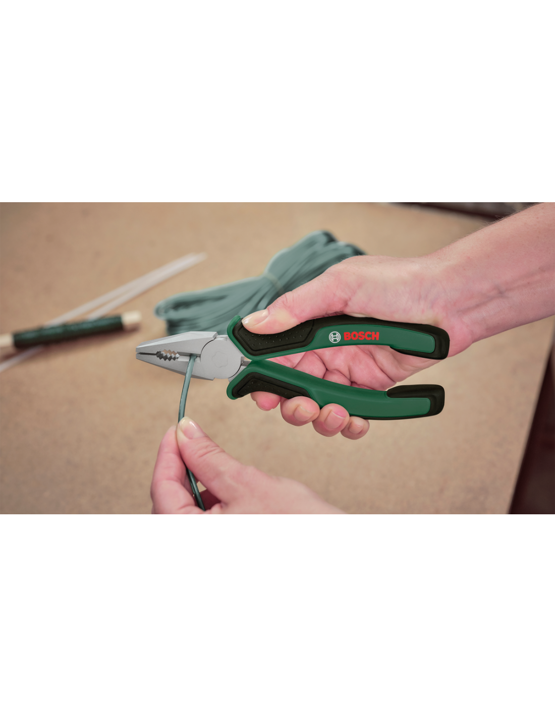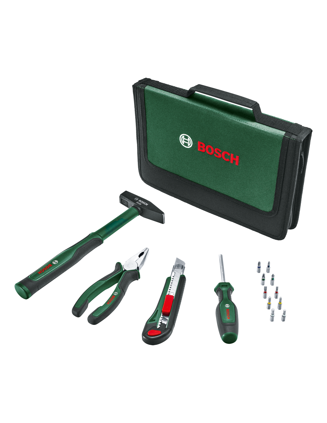 El juego básico de 14 herramientas manuales de Bosch tiene todas las herramientas necesarias para tareas básicas de bricolaje. Incluye alicates, un martillo, un cúter, un destornillador universal y puntas de atornillar, un maletín de tela con cremallera permite guardar las herramientas y facilita su transporte. El juego básico de 14 herramientas manuales de Bosch tiene todas las herramientas necesarias para mantenimiento y reparaciones de bricolaje, montaje de muebles o construcción sencilla. Práctico almacenamiento en una bolsa de tela con cremallera, el juego incluye alicates combinados, un martillo de cerrajero de 300 g, un cúter y un destornillador universal, junto con 10 puntas de atornillar. Cada producto está fabricado de forma resistente con materiales de alta calidad y está diseñado de forma ergonómica para ofrecer una larga vida útil junto con máximo confort y control.