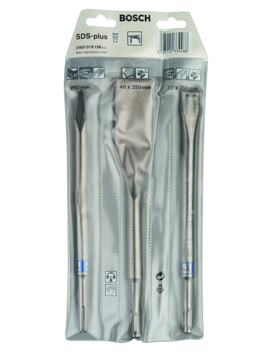 Juego de cinceles SDS plus de tres piezas: plano, puntiagudo y para azulejos para aplicaciones en diversos materiales - Los cinceles son compatibles con los accesorios para cincel SDS plus o pueden ser utilizados directamente en martillos SDS plus con tope de rotación. Compatible con todos los martillos perforadores SDS plus. Para renovación y restauración - El juego de cinceles SDS plus de 3 piezas incluye un cincel plano, un cincel puntiagudo y un cincel para azulejos para una gran variedad de aplicaciones de renovación y restauración en diversos materiales. Todos estos cinceles autoafilables han sido diseñados para satisfacer las demandas de materiales específicos proporcionando una alta velocidad de eliminación de material y escasos atascos. El cincel plano tiene "Power Ribs" para crear fisuras laterales y verticales en hormigón. El cincel puntiagudo cuenta con una punta girada que produce un gran impacto en la eliminación de material y menos atascos, mientras que el cincel para azulejos tiene un diseño plano biselado que permite retirar el azulejo entero sin romperlo. Este juego ha sido diseñado para hormigón, ladrillos y azulejos. Los cinceles son compatibles con los accesorios para cincel SDS plus o pueden ser utilizados directamente en martillos SDS plus con tope de rotación. Todos los cinceles incluidos en el juego son autoafilables y cuentan con una larga vida útil y una velocidad de eliminación de material un 30 % superior que los cinceles estándar. Compatible con todos los martillos perforadores SDS plus.