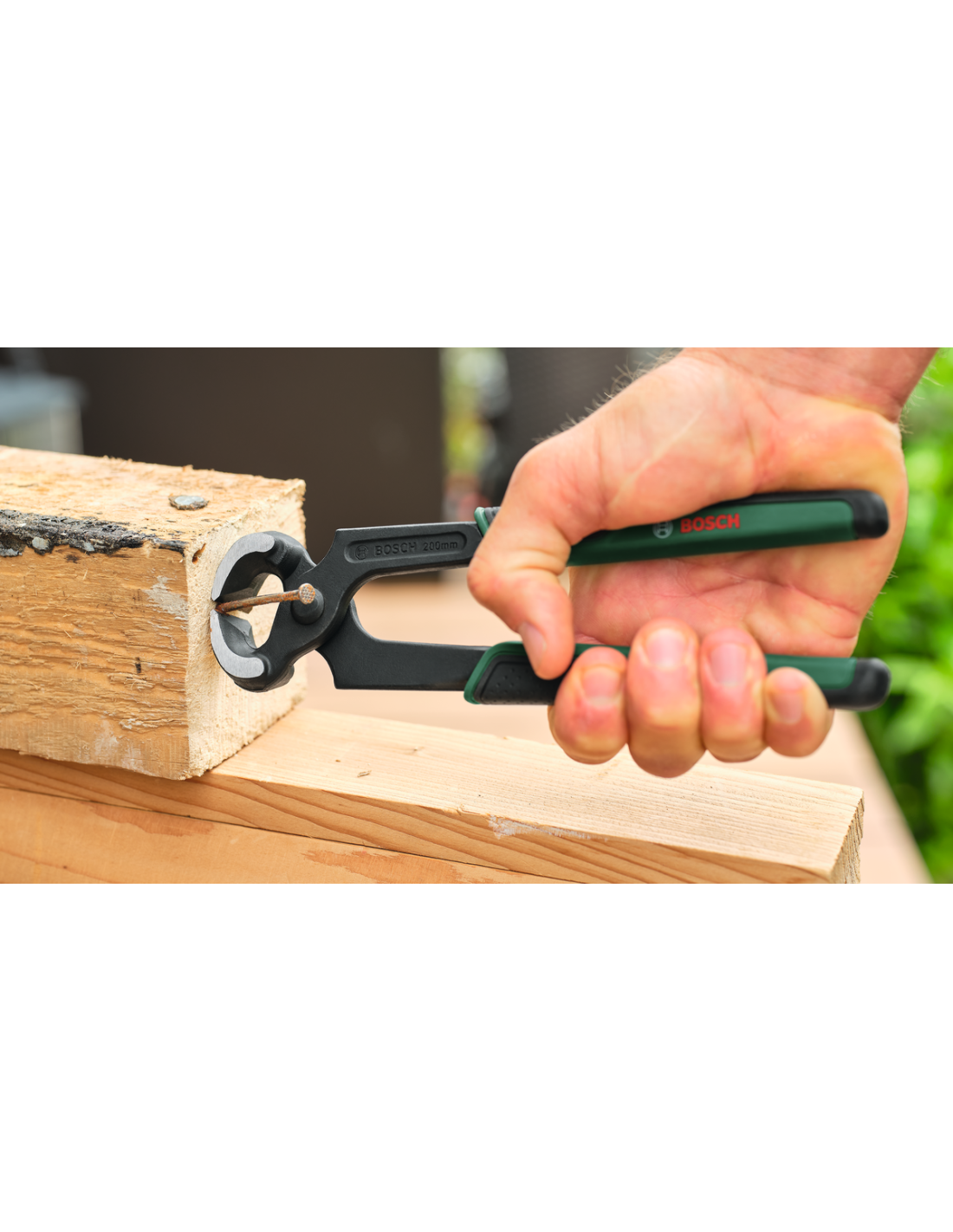 Las tenazas de carpintero de Bosch son ideales para múltiples trabajos de tracción y corte al ras. Esta herramienta, resistente, con bordes endurecidos y empuñadura ergonómica y engomada Softgrip, está diseñada para durar y para usarse con comodidad. Las tenazas de carpintero de Bosch, de excelentes prestaciones, son la herramienta perfecta para múltiples trabajos, como extraer clavos o cortar al ras. Una herramienta imprescindible para todo entusiasta del bricolaje. Estas tenazas, con bordes endurecidos de 60 +/-2 HRC y cabeza grande, se pueden utilizar para varios trabajos. Fabricadas en acero al cromo vanadio, con acabado de fosfato negro, están hechas para durar y resistir la corrosión, asegurando una larga vida útil. El diseño ergonómico y la empuñadura engomada Softgrip garantizan el máximo control, transmisión de potencia y confort. Además, la bisagra permite abrir y cerrar las tenazas fácilmente y con precisión.